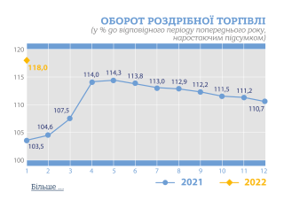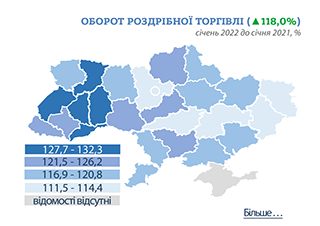22.02.2022 Індекси фізичного обсягу обороту роздрібної торгівлі у січні 2022 року П лощі, валові збори та урожайність сільськогосподарських культур за їх видами у 2021 році (попередні дані)