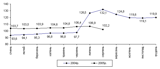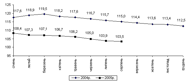 Індекс споживчих цін за 8 місяців 2005р. становив 106,7% (за відповідний період попереднього року – 104,3%). Темпи приросту цін (тарифів) на продовольчі товари (7,7%) та послуги (7,0%) випереджали приріст цін на непродовольчі товари (2,9%).