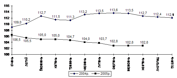 Індекс споживчих цін (індекс інфляції) за 10 місяців 2005р. становив 108,1% (за відповідний період попереднього року – 107,9%). У січні–жовтні 2005р. темпи приросту цін (тарифів) на послуги (12,7%) випереджали приріст цін на продовольчі (8,0%) та непродовольчі товари (3,9%).