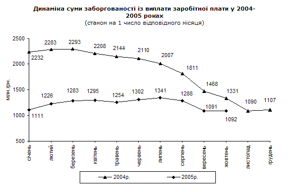 Загальна сума невиплаченої заробітної плати за 9 місяців 2005р. зменшилась на 1,7%, або на 18,8 млн.грн., і на 1 жовтня 2005р. становила 1092,5 млн.грн. Обсяг боргу дорівнював 11,0% фонду оплати праці, нарахованого за вересень 2005р., проти 18,2% рік тому.