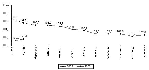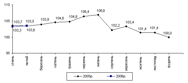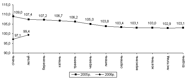 Індекс споживчих цін (індекс інфляції) у січні–лютому 2006р. становив 103,0% (у відповідному періоді попереднього року – 102,7%). У січні–лютому темпи приросту цін на продовольчі товари (4,2%) суттєво випереджали приріст цін (тарифів) на послуги (1,5%) та непродовольчі товари (0,2%).