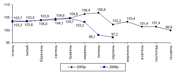 Індекс споживчих цін (індекс інфляції) у січні–серпні 2006р. становив 103,8% (у відповідному періоді попереднього року – 106,7%). У січні–серпні ціни (тарифи) на продовольчі товари знизилися на 0,4%, а на послуги та непродовольчі товари зросли відповідно на 20,3% та 2,1%.