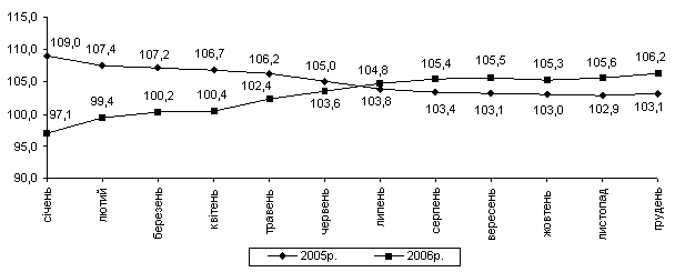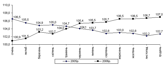 Індекс споживчих цін (індекс інфляції) за 2006р. становив 111,6% (у 2005р. – 110,3%). На споживчому ринку за рік в цілому темпи приросту цін (тарифів) на послуги (49,4%) випереджали приріст цін на продовольчі (3,5%) та непродовольчі товари (2,5%).