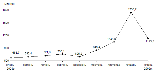 Вимоги банків України за наданими кредитами (включаючи нараховані відсотки) за грудень 2008р. збільшились на 9,3% і на 1 січня 2009р. становили 734 млрд.грн., з яких 300,2 млрд.грн. – у національній валюті.