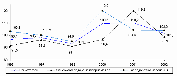 У 2002р. продовжувалася позитивна тенденція нарощування обсягів сільськогосподарського виробництва, хоча темпи зростання знизилися. За попередніми даними виробництво сільськогосподарської продукції проти 2001р