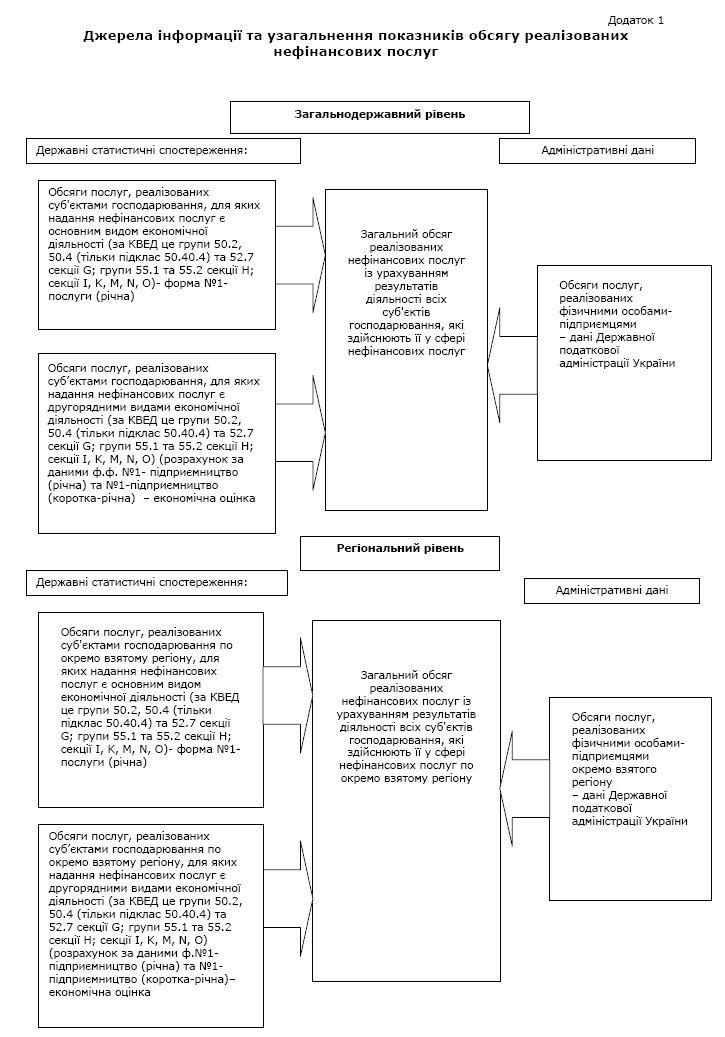 Схема джерел інформації та узагальнення показників обсягу реалізованих нефінансових послуг наводиться у Додатку 1.
