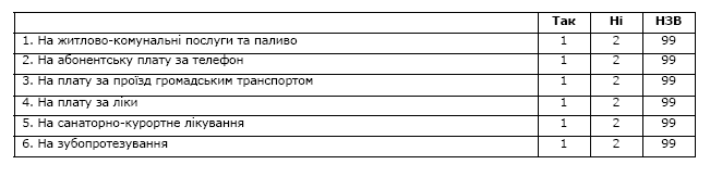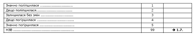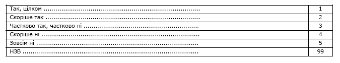 Увага! В таблиці не повинно лишитися незаповнених рядків! Якщо респондент не може надати відповідь, оцінити твердження або йому важко відповісти, позначте варіант відповіді 99 (НЗВ).