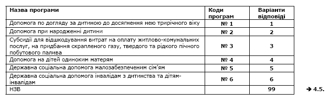 Увага! Якщо по кожній з програм респондент не надав відповіді або йому важко відповісти (відмічено всі варіанти відповіді 99 (НЗВ)), переходьте до запитання 4.5.