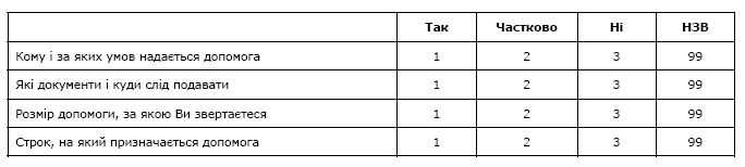 - проблеми, які виникали при оформленні та отриманні допомоги, та швидкість їх вирішення;