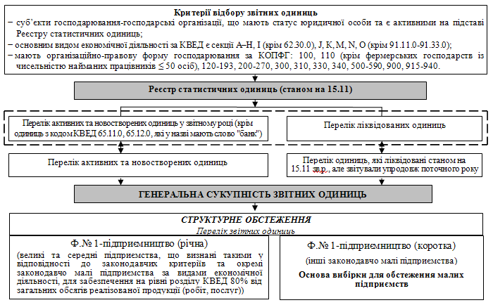 Генеральна сукупність малих підприємств є частиною генеральної сукупності звітних одиниць міжгалузевої статистики підприємств, яка формується на державному рівні на підставі статистичного реєстру підприємств, річного та квартального структурного обстеження та річної та квартальної фінансової звітності.