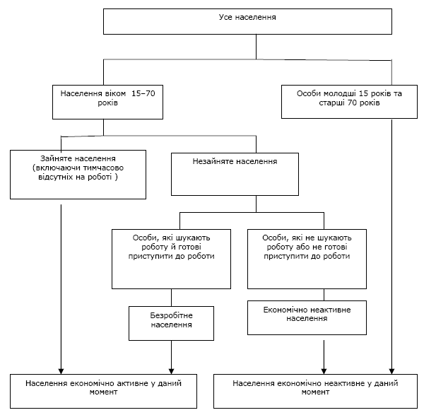 З урахуванням рекомендацій МОП та вікової структури зайнятого населення економічну активність населення в Україні визначають щодо осіб обох статей віком від 15 до 70 років включно.