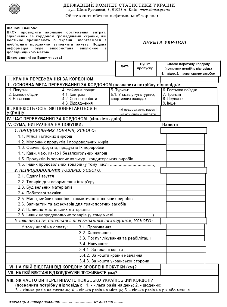 Метою проведення державного статистичного спостереження неформальної торгівлі в прикордонному русі є отримання інформації від іноземців, які виїжджають з України, та громадян України, які повертаються до країни щодо розміру понесених витрат на придбання товарів та оплату послуг із визначенням структури витрат, пов’язаних з перебуванням відповідно в Україні та за кордоном. Тобто це дослідження нефіксованих в митних документах витрат на товари та послуги. На базі отриманих даних провести розрахунок загальних обсягів неформальної торгівлі.