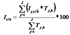 5.1. Базова формула для розрахунку індексу обороту за своєю суттю є індексом Ласпейреса. Індекс за місяць t до базисного року визначають як співвідношення обсягу реалізованої промислової продукції за певний місяць у цінах базисного року до середньомісячного обсягу реалізованої промислової продукції базисного року у фактичних цінах: