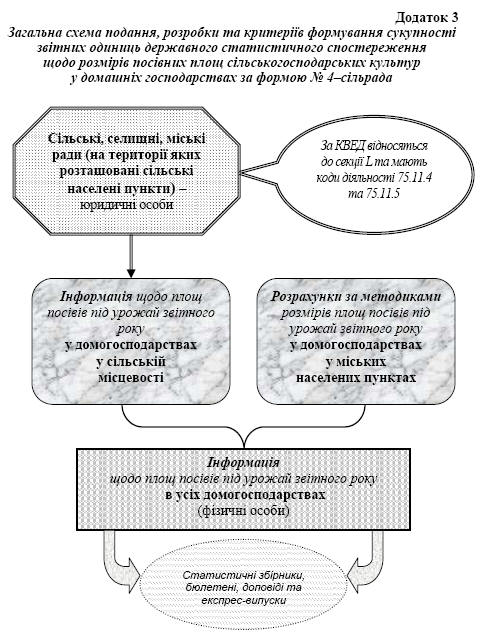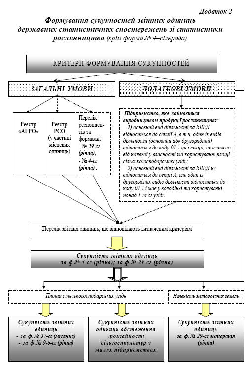 Загальну схему формування сукупностей звітних одиниць державного статистичного спостереження щодо площ, валових зборів та урожайності сільськогосподарських культур, плодів, ягід та винограду за формами № 4–сг (річна), № 29–сг (річна), № 29–сг (меліорація) (річна) і № 37–сг (місячна) та державного статистичного спостереження щодо внесення мінеральних та органічних добрив, вапнування та гіпсування ґрунтів за формою № 9–б–сг (річна) наведено в додатку 2.