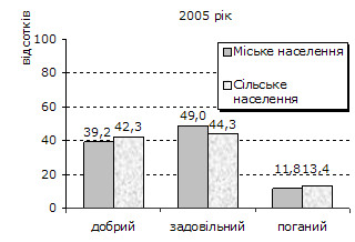 Підсумки опитування, розповсюджені на всі домогосподарства України, свідчать про збереження тенденцій щодо позитивних зрушень в оцінці населенням стану свого здоров’я. У 2005р. 40% населення (проти 38% – у 2004р.) оцінювало його як “добрий” (додаток 1). Найвища частка таких осіб (69%–59%) була серед підлітків, дітей до 14 років (за оцінкою батьків), чоловіків та жінок у віці 18-29 років. Добрий стан свого здоров’я серед населення у працездатному віці відмітили майже кожен другий чоловік та двоє з п’яти жінок.