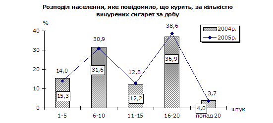 За даними опитування шкідливу звичку курити, як і в 2004р., має чверть населення у віці 12 років і старші (додаток 6). Майже кожен третій громадянин з тих, які мають цю звичку, курить понад 20 років.