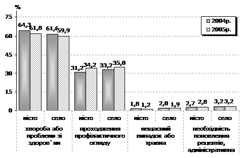 Порівняно з 2004р. серед міського та сільського населення зменшилася частка осіб, які зверталися до лікаря через хворобу або проблеми зі здоров’ям, у зв’язку з нещасним випадком або травмою. Умови конкуренції, притаманні ринковим відносинам в суспільстві, зокрема, на ринку праці, а також висока вартість медичних товарів та послуг, змушують населення приділяти більше уваги збереженню свого здоров’я шляхом проходження профілактичних оглядів. В порівнянні з 2004р. частка осіб, які зверталися до лікаря з метою проходження профілактичного огляду, збільшилася у міських поселеннях на 3 в.п., у сільських – на 2 в.п.