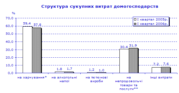 Найбільш вагомою статтею (58%) сукупних витрат домогосподарств продовжували залишатися витрати на харчування (включаючи харчування поза домом). У порівнянні з І кварталом 2005р. частка цих витрат зменшилася на 1,6 в.п.