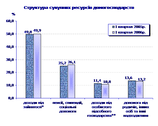 Продовжувалися позитивні зміни у структурі формування ресурсів домогосподарств. Збільшилася частка грошових доходів у структурі сукупних ресурсів домогосподарств з 83% у січні–березні 2005р. до 84% у І кварталі 2006р.