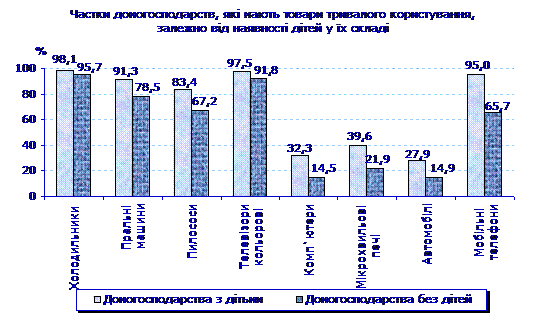 Зокрема, серед 100 домогосподарств з однією або двома дітьми холодильники мали 98 домогосподарств (серед багатодітних – 96), кольорові телевізори – 98 (97), пральні машини – 91 (89), пилососи – 84 (66), фотоапарати – 57 (48), мікрохвильові печі – 40 (25), комп’ютери – 33 (22), відеомагнітофони – 28 (25).