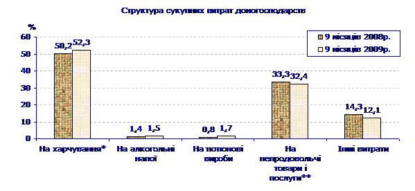 на харчування (включаючи харчування поза домом). Порівняно з 9 місяцями 2008р.