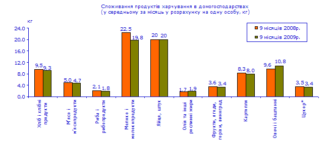 У домогосподарствах з дітьми однією особою було спожито більше, ніж у січні–вересні 2008р., овочів та баштанних – на 13%, олії та інших рослинних жирів – на 7%. Одночасно у цій групі домогосподарств зменшилося споживання риби та рибних продуктів – на 13%, молока та молочних продуктів – на 10%, м’яса та м’ясопродуктів – на 5%, картоплі – на 4%, фруктів, ягід, горіхів та винограду – на 3%. Залишилося на рівні 9 місяців 2008р. споживання хліба і хлібних продуктів, яєць та цукру. Кількість основних продуктів харчування, спожитих однією особою в домогосподарствах з дітьми, була в 1,6–1,2 раза меншою, ніж у домогосподарствах без дітей.