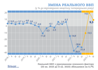Реальний ВВП у IIІ кварталі 2023 року збільшився порівняно з попереднім кварталом на 0,7% (з урахуванням сезонного фактору), а порівняно з IIІ кварталом 2022 року – на 9,3%.