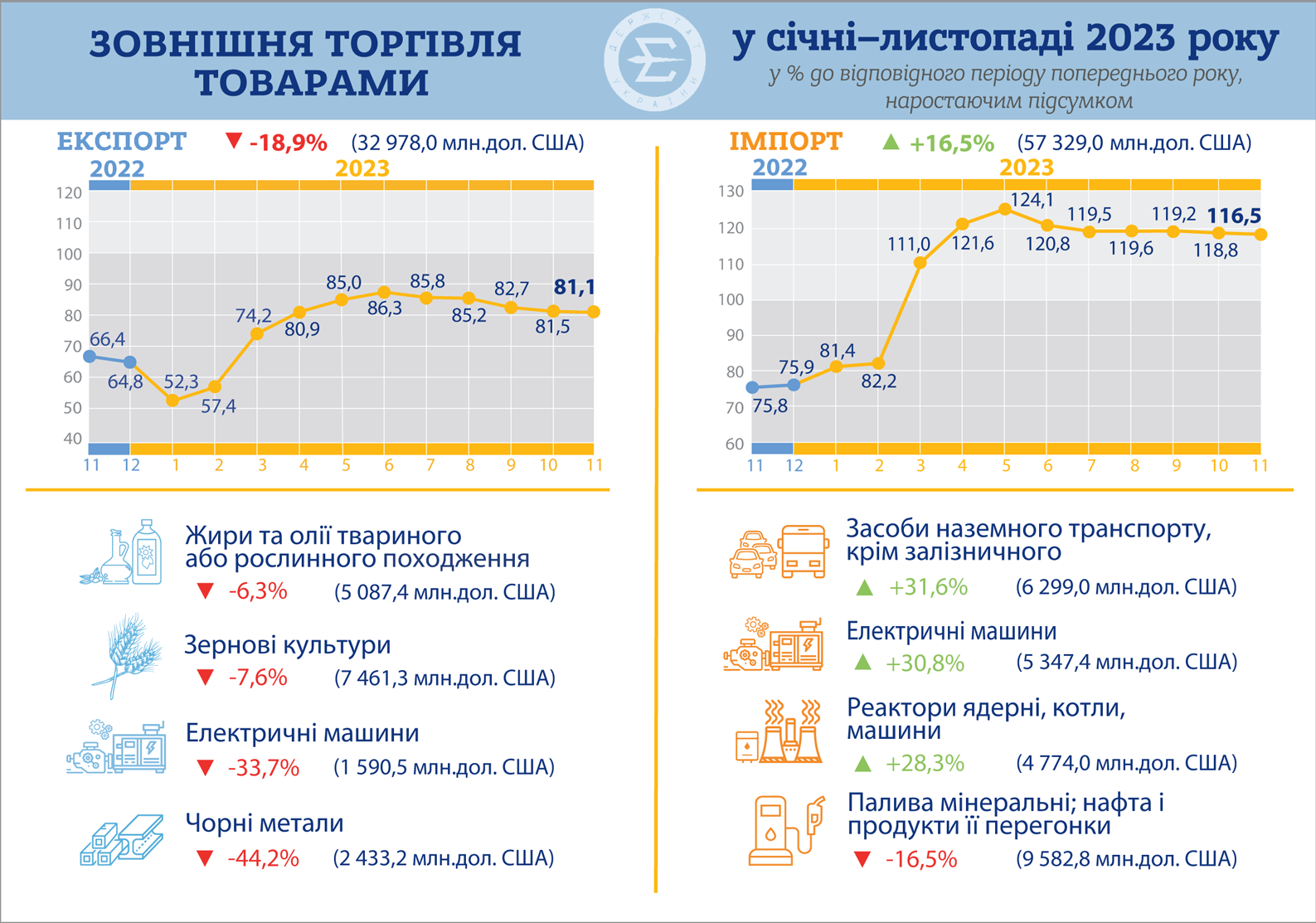Зовнішня торгівля України товарами за січень-листопад 2023 року