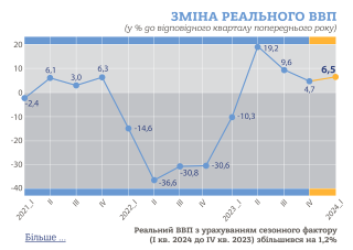 Реальний ВВП у I кварталі 2024 року збільшився порівняно з попереднім кварталом на 1,2% (з урахуванням сезонного фактору), а порівняно з I кварталом 2023 року – на 6,5%.