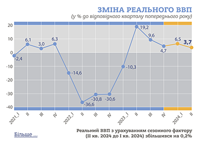 Реальний ВВП у II кварталі 2024 року збільшився порівняно з попереднім кварталом на 0,2% (з урахуванням сезонного фактору), а порівняно з II кварталом 2023 року – на 3,7%.