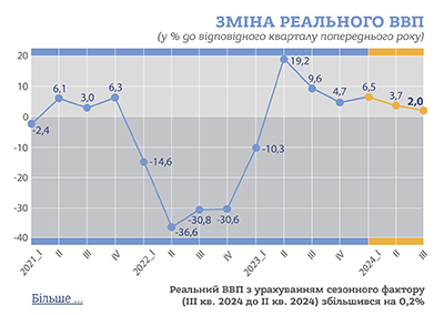 Реальний ВВП у III кварталі 2024 року збільшився порівняно з попереднім кварталом на 0,2% (з урахуванням сезонного фактору), а порівняно з III кварталом 2023 року – на 2,0%.