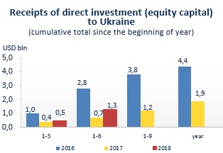 Receipts of direct investment (equity capital) in Ukraine as of January-June 2018
