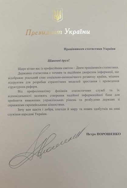 Вітання Президента України П. Порошенка з Днем працівників статистики