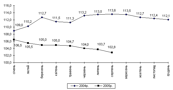 Індекс споживчих цін за 8 місяців 2005р. становив 106,7% (за відповідний період попереднього року – 104,3%). Темпи приросту цін (тарифів) на продовольчі товари (7,7%) та послуги (7,0%) випереджали приріст цін на непродовольчі товари (2,9%).