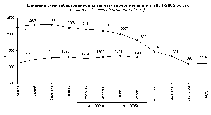 Загальна сума невиплаченої заробітної плати (з урахуванням економічно активних підприємств, суб’єктів господарювання, щодо яких реалізовуються процедури відновлення платоспроможності боржника або визнання його банкрутом, а також економічно неактивних підприємств) порівняно з початком 2005р. зросла на 15,9%, або на 176,6 млн.грн., і на 1 серпня 2005р. становила 1287,8 млн.грн., що дорівнює 13,2% фонду оплати праці, нарахованого за липень 2005р., проти 25,6% торік.