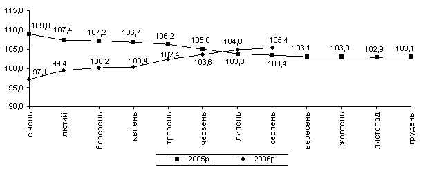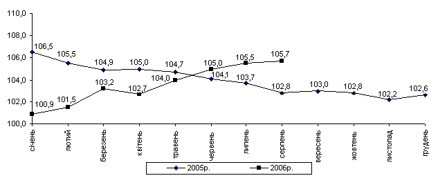 Індекс споживчих цін (індекс інфляції) у січні–серпні 2006р. становив 103,8% (у відповідному періоді попереднього року – 106,7%). У січні–серпні ціни (тарифи) на продовольчі товари знизилися на 0,4%, а на послуги та непродовольчі товари зросли відповідно на 20,3% та 2,1%.