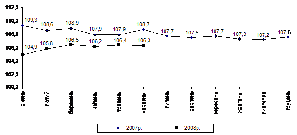 Індекс споживчих цін (індекс інфляції) у січні–червні 2008р. становив 115,5% (у січні–червні 2007р. – 104,2%).