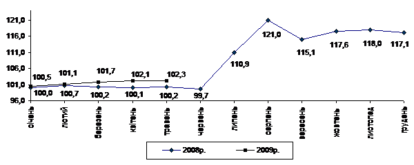 Індекс споживчих цін (індекс інфляції) у січні–травні 2009р. становив 107,4% (у січні–травні 2008р. – 114,6%).