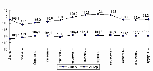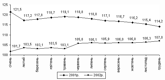 за 2002р. становив 99,4% (у попередньому році - 106,1%). На споживчому ринку у 2002р. ціни (тарифи) на продовольчі товари знизилися на 2,3%, на послуги та непродовольчі товари зросли відповідно на 3,4% та 1,6%.На продовольчому ринку найбільше (на 41,7%) подешевшала картопля. На 16,9-6,5% знизилися в ціні м’ясо і птиця, тваринні жири, борошно та яйця, на 5-1,5% - олія, хліб, хлібобулочні та макаронні вироби, ковбасні вироби і копченості, сир і бринза. Водночас відбулося суттєве подорожчання овочів (на 32,7%), на 18,6-6,9% стали дорожчими крупи і бобові, фрукти, вершкове масло, мед, цукор, обіди у закладах ресторанного господарства.