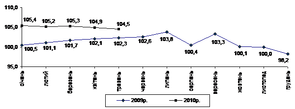 Індекс споживчих цін (індекс інфляції) у січні–травні 2010р. становив 103,7% (у січні–травні 2009р. – 107,4%).
