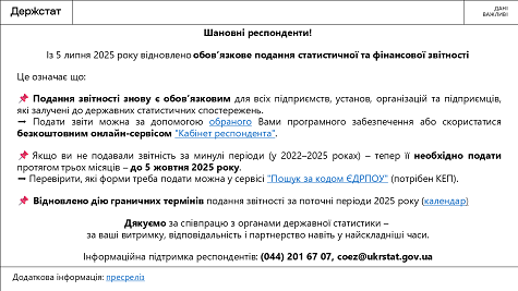Зміни у поданні форм державних статистичних спостережень до органів державної статистики на 2025 рік