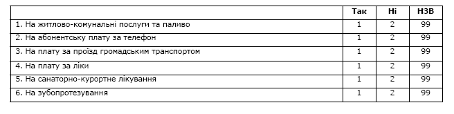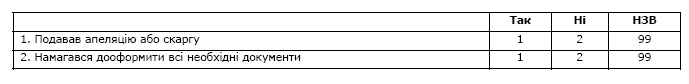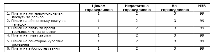 Увага! В таблиці не повинно лишитися незаповнених рядків! Якщо респондент не може надати відповідь, оцінити твердження або йому важко відповісти, позначте варіант відповіді 99 (НЗВ).