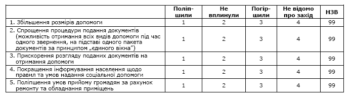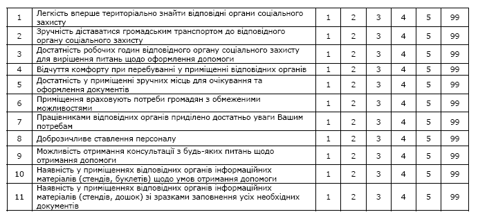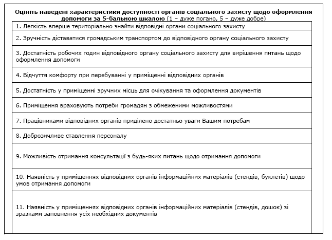 · оцінка користувачами роботи соціальних служб (за доступністю, якістю обслуговування, обладнаністю приміщень, якістю інформаційного забезпечення, професіоналізмом персоналу, часу, який витрачається на оформлення);