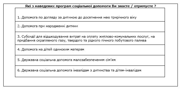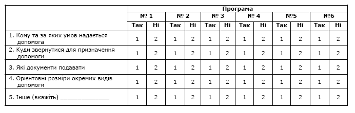 · ступінь інформованості населення щодо чинних в Україні програм соціальної допомоги та джерела отримання інформації;