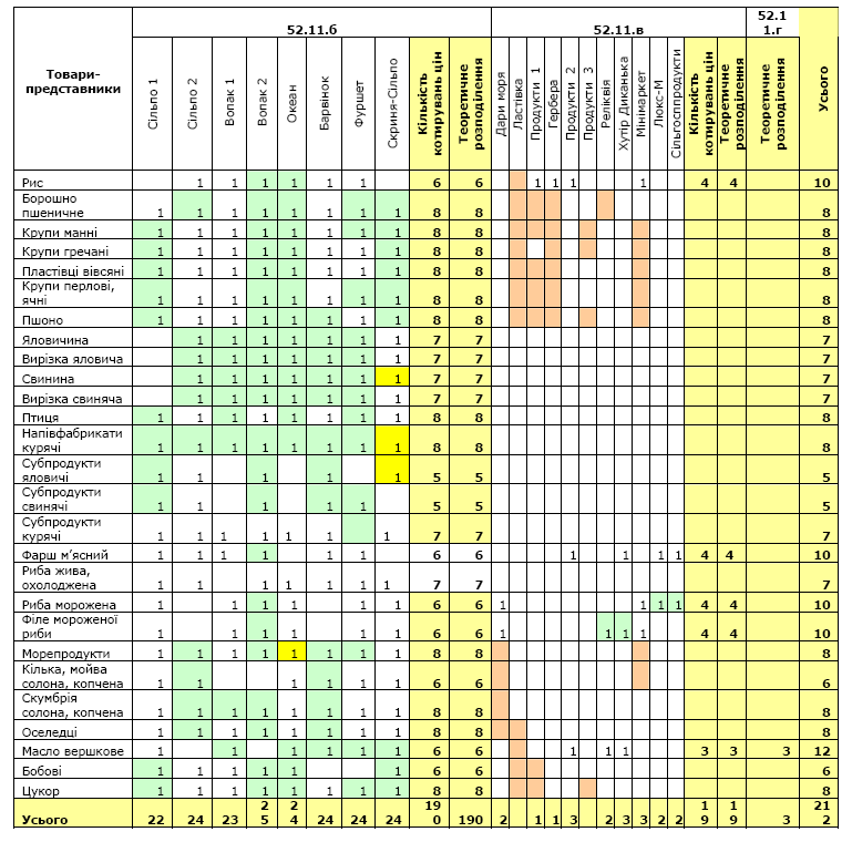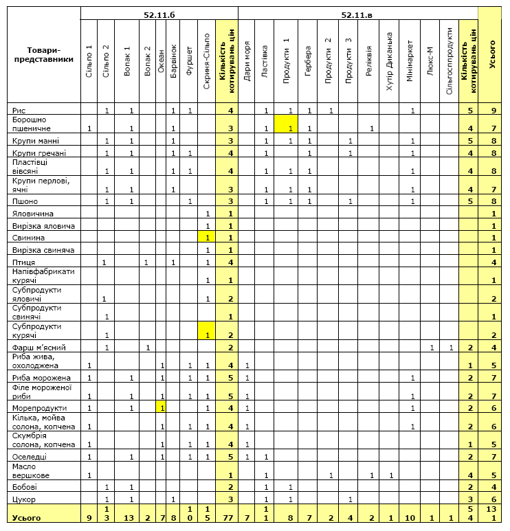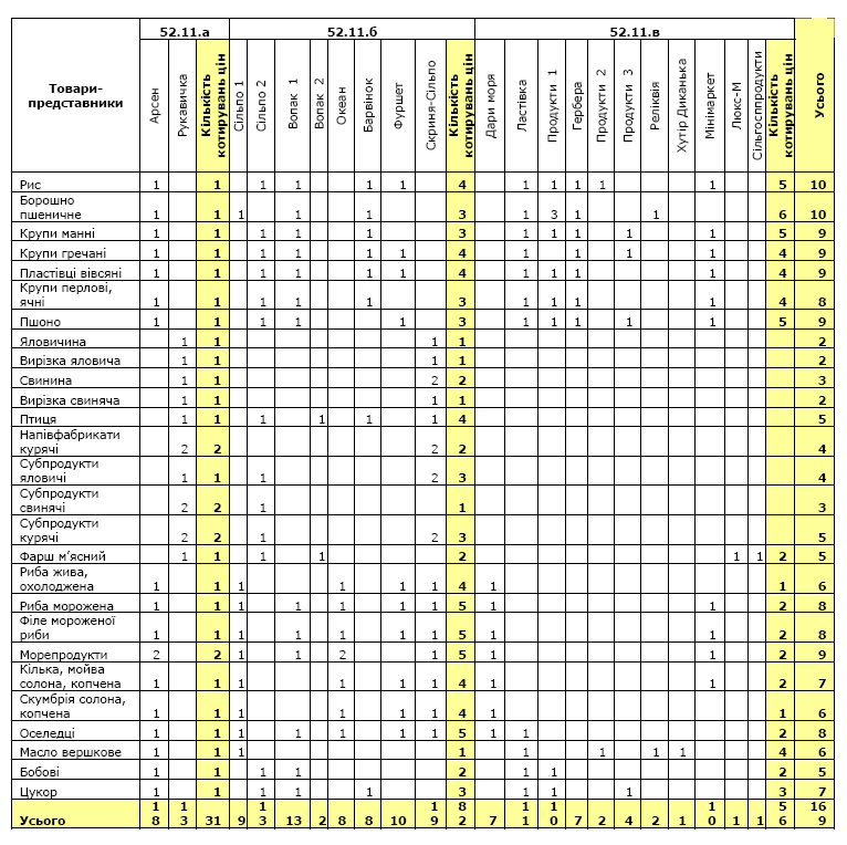 розподіл кількості котирувань цін за товарами-представниками між підприємствами торгівлі та ринками;
