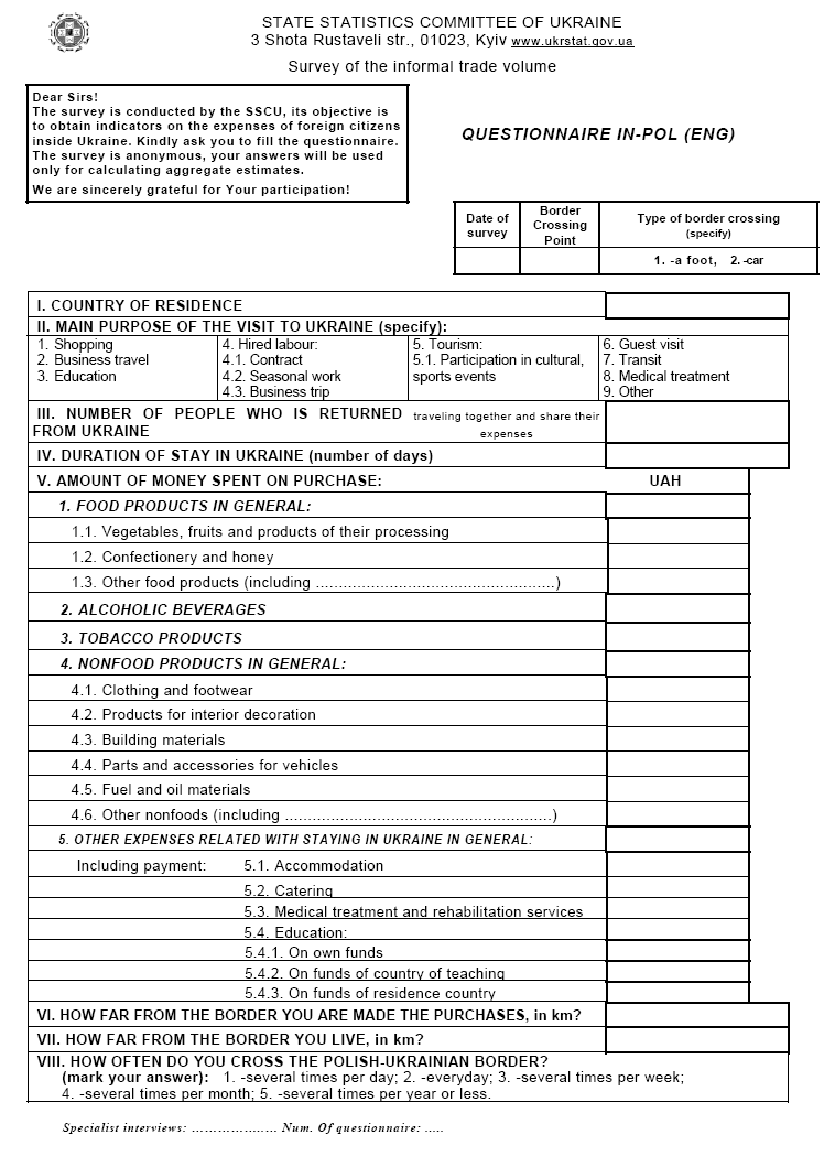 Анкети є основним джерелом та інструментом отримання інформації при обстеженні обсягів неформальної торгівлі. Анкету готують окремо як для громадян України, так і для іноземців, відповідно на декількох мовах.