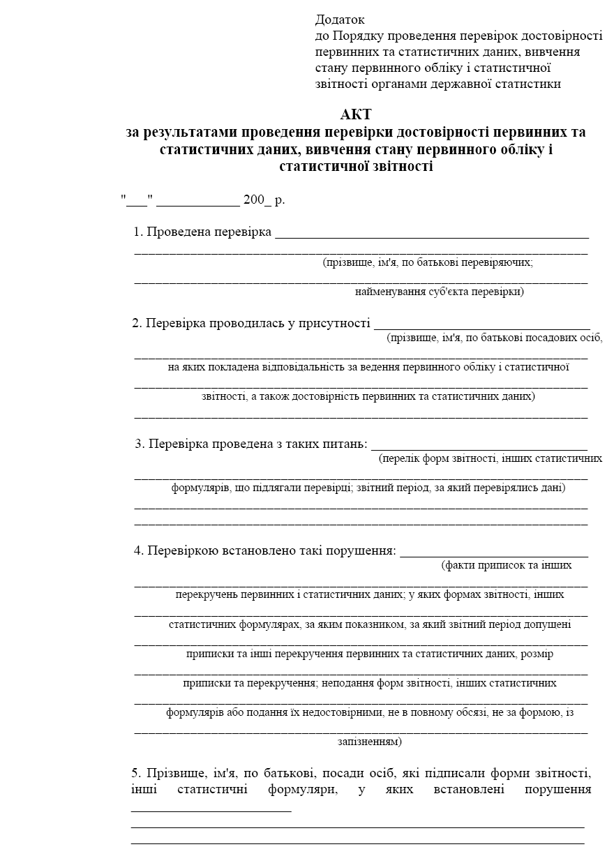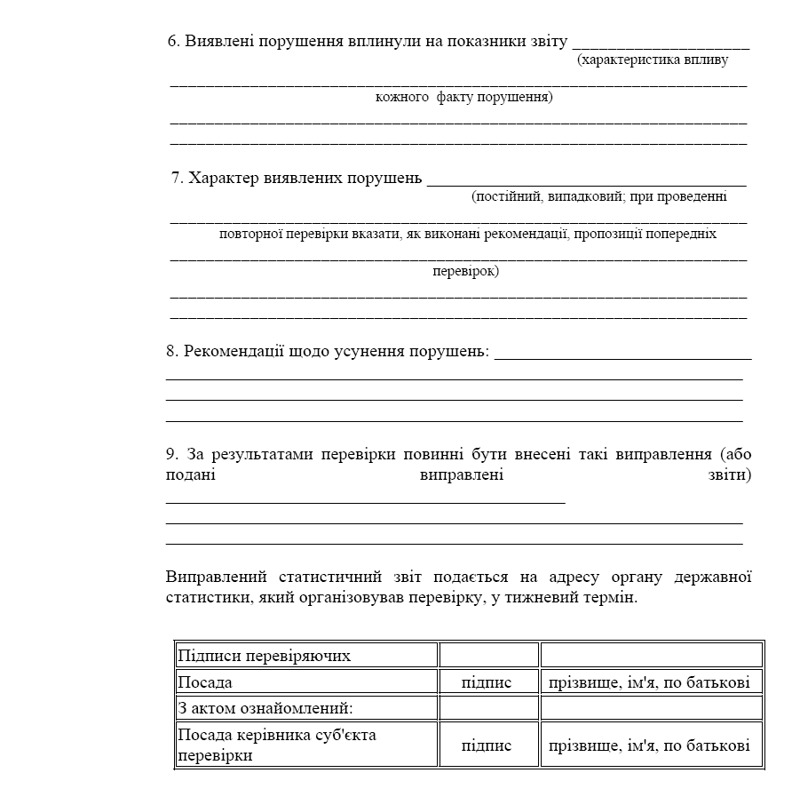 6.2. За кожним фактом приписок та перекручень даних в акті вказується, у якій формі звітності та статистичному формулярі, за яким показником, за який звітний період допущені приписки та перекручення даних, розмір приписки та перекручення, причини недостовірності даних, прізвища і посади осіб, які підписали документ.