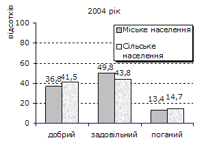 Підсумки опитування, розповсюджені на всі домогосподарства України, свідчать про збереження тенденцій щодо позитивних зрушень в оцінці населенням стану свого здоров’я. У 2005р. 40% населення (проти 38% – у 2004р.) оцінювало його як “добрий” (додаток 1). Найвища частка таких осіб (69%–59%) була серед підлітків, дітей до 14 років (за оцінкою батьків), чоловіків та жінок у віці 18-29 років. Добрий стан свого здоров’я серед населення у працездатному віці відмітили майже кожен другий чоловік та двоє з п’яти жінок.