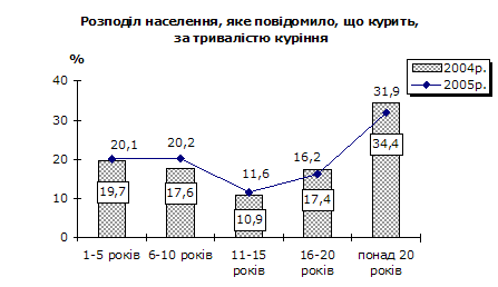 За даними опитування шкідливу звичку курити, як і в 2004р., має чверть населення у віці 12 років і старші (додаток 6). Майже кожен третій громадянин з тих, які мають цю звичку, курить понад 20 років.