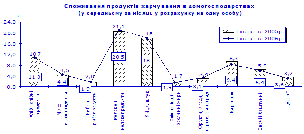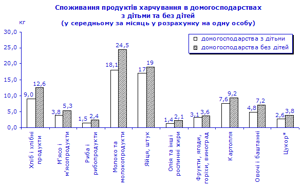 У домогосподарствах з дітьми однією особою було спожито на 3–7% більше, ніж у січні–березні 2005р., м’яса та м’ясопродуктів, молока та молочних продуктів, фруктів, ягід, горіхів та винограду, риби та рибопродуктів. Одночасно у цій групі домогосподарств зменшилося споживання хліба і хлібних продуктів, овочів і баштанних, олії та інших рослинних жирів, картоплі, цукру – на 1–13%. Споживання яєць залишилося на рівні січня–березня минулого року. Кількість спожитих основних продуктів харчування однією особою в домогосподарствах з дітьми була в 1,1–1,6 раза меншою, ніж у домогосподарствах без дітей.